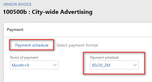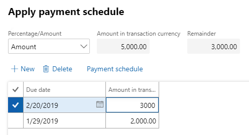 The system offers an option to set a schedule of payments. You can use a payment schedule if the invoice has to be paid in a few payments; for example, if the first payment is 70% and the second 30%. To resolve this requirement the payment schedule must be set up and linked to the terms of payment.