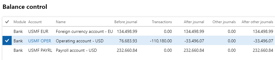 The system has the “Balance control” page that you can use to make sure that there is a sufficient amount in the bank accounts to cover all proposed payments.