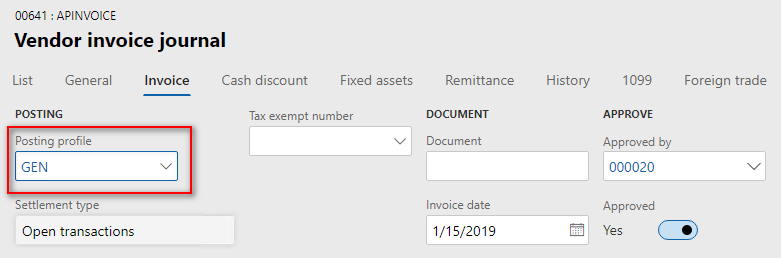 To define a ledger account where liability must be posted, the system uses a posting profile which is linked to the source document. Here is an example of an invoice journal line below.