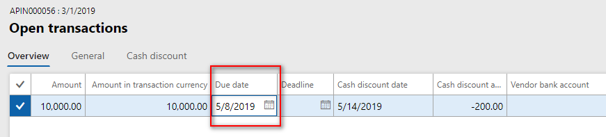 To find out the due dates of the invoice, you need to select an invoice transaction on the “Vendor transactions” page and click the “Open details” button. Please note that the invoice transaction must have an open balance, otherwise the system doesn’t show any rows in the “Open transactions” page. On this “Open transactions” page, you can find a due date and the due date can be changed there.