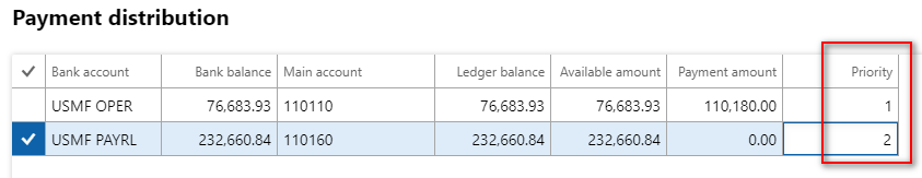 In case the company has a few bank accounts that can be used to pay, and the balance control shows that the distribution of payments isn’t appropriate, it’s possible to change the distribution of payments among the bank accounts. To do so, use the “Payment distribution” button on the “Vendor payment proposal” page. By clicking the button, the system shows the “Payment distribution” form. You can set the priority in of the bank account there.