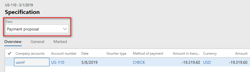 The example above shows that the open transaction is marked with a payment proposal, meaning that there is a payment proposal created in the system that is not transformed to the journal line yet. To define for which journal the payment proposal is created, have a look at the “Journal batch number” field on the “General” tab. To delete payment proposals, go to that journal and run the “Payment proposal / Create payment proposal” function there, and then click the “Cancel” button in the vendor proposal form.