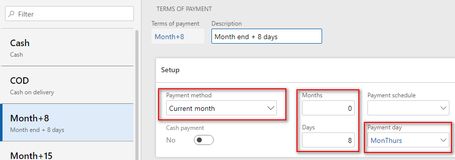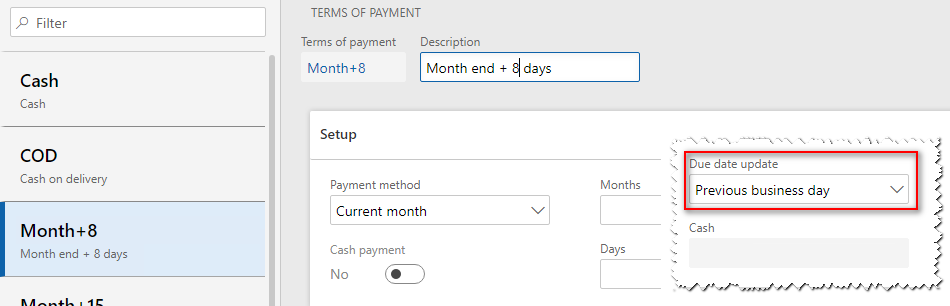 The key field in the “Terms of payment” page is the “Payment method.” The value in the field defines how to calculate the due date of the invoice. The “Net” value of the field means that the system uses the date of the invoice as a due date, and the “Current month” value means that the system takes the last date of the month, specified in the invoice date. The “COD” value stands for “Cash on delivery.”