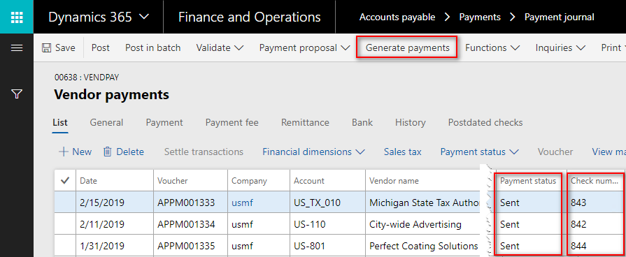 When the lines in the payment journal are ready, the next step is to generate payments. This means that checks can be printed or, in case of electronic payment, a file for the bank can be prepared. The “Generate payments” button in the “Vendor payments” page is used to start generating the payments. When the generating is done, the payment status is changed to “Sent.” If checks are used, the system also generates check numbers.