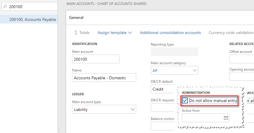 Let’s say the 200100 ledger account is specified in a vendor posting profile. If this account is used as shown in the image below, it would lead to differences between module and ledger data.