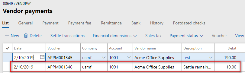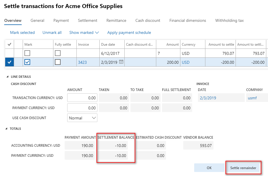 For instance, you’re creating a vendor payment in the payment journal for the exact amount. While marking the payment and invoice you find that the payment amount is less than the invoice amount. You’re totally sure that the invoice will not be paid in full and that is why it can be necessary to settle the remainder of the invoice. In this case, the “Settle remainder” function can be very handy.