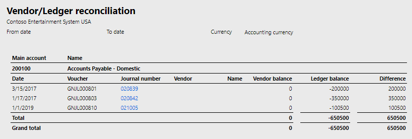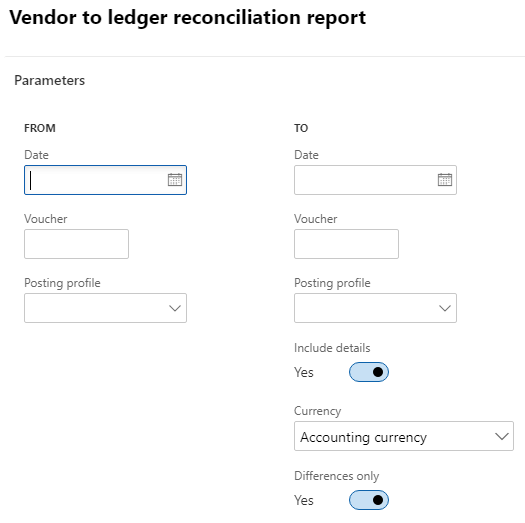The system also has a control if there are any differences between the vendor module and ledger amounts. The report is designed to compare data for a period. If you run the report with the parameters as in the image below, the report takes all ledger accounts from the vendor profiles, then fetches all ledger entries for these accounts, and then compares these entries with vendor transactions.