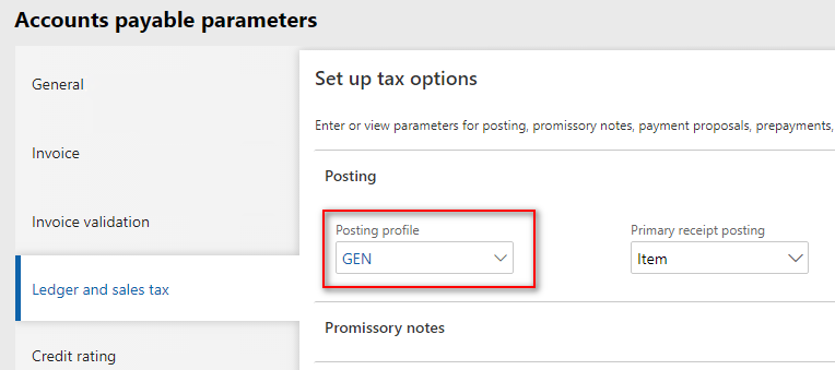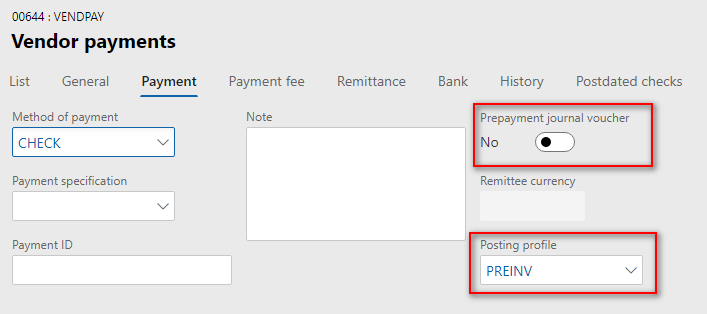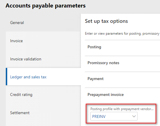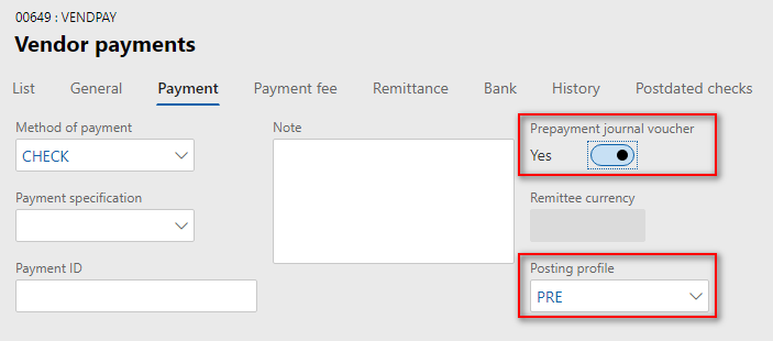 A prepayment posting profile must be specified in the accounts payable parameters. The system sets this profile in the payment journal line when the prepayment journal voucher is activated there.