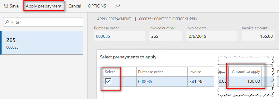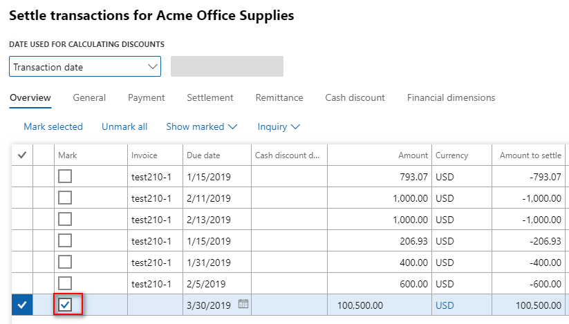 It is also possible to mark prepayments with invoice journal lines. The system settles marked prepayments with the invoice when the invoice is posted.