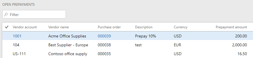 The system settles the payment and the prepayment invoice. This means that vendor transactions don’t have open balances. The information about prepayment is kept only in the ledger on the account for prepayments. This account was debited when we posted a prepayment invoice.