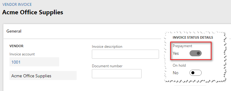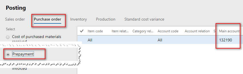 The system has an option to manage prepayments by using a functionality known as “prepayment invoices.” This option is available only if you use purchase orders. This means that is not possible to use this option if an invoice journal or invoice register is used.