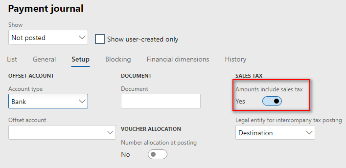 Prepayment journal vouchers can be used only if the payment amounts in the journal lines include sales tax. This setting must be specified in the payment journal header.