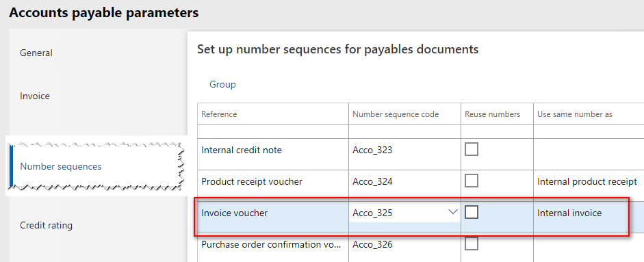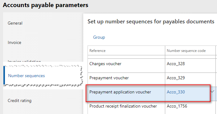 A voucher prefix is specified in a number sequence. The number sequence is set in the accounts payable parameters.