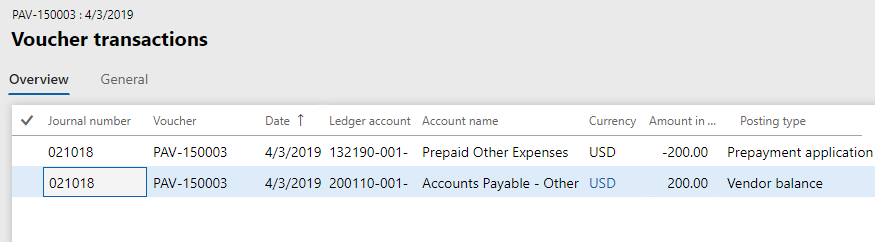 When the payment is posted, the system creates a voucher to record prepayment in the vendor transactions and settles it with the prepayment invoice.