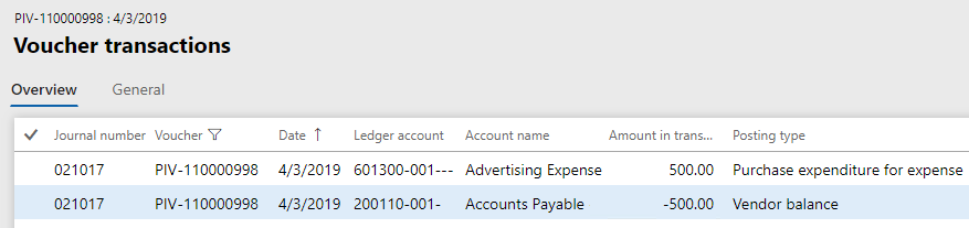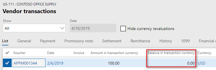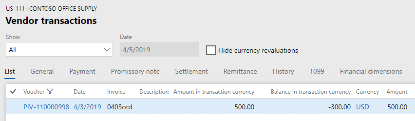 The system also settles the invoice voucher and the prepayment application voucher in the vendor transactions.