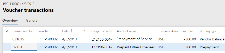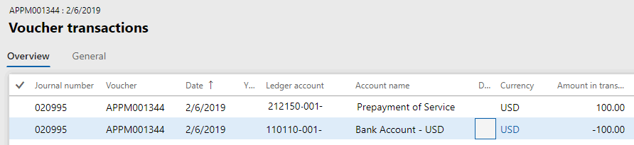 Registering the prepayment doesn’t post any module or ledger transactions.