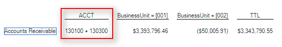To show ledger accounts which were used to get records, you can use the ACCT column type in the column definition. The example of the report is shown below.