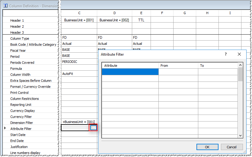 Financial reporting allows to specify attribute filters in the column and row definitions. To specify the filter for the column, you need to use the “Attribute Filter” cell in the column definition. The filter is applied to the all cells of the column in the report.
