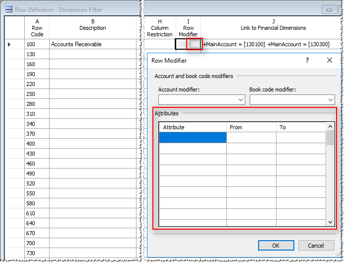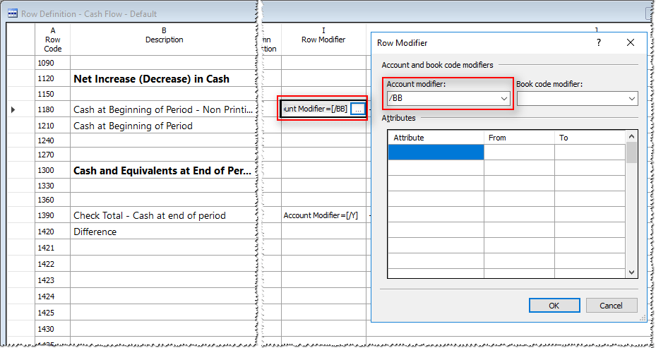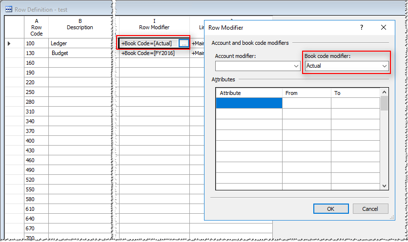 Financial reporting functionality allows to specify a book code for the row. This setting overrides the book code specified in the column definition. To override the book code, you need to use the “Row modifier” field in the row definition.