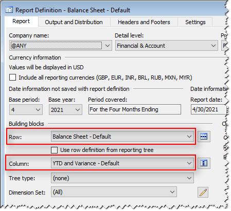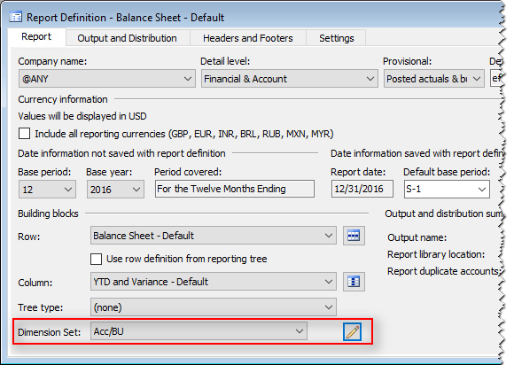 The important thing to remember is the following: in a typical scenario, the system queries the transactions by financial dimension values specified in the row, and for the period defined in the column.