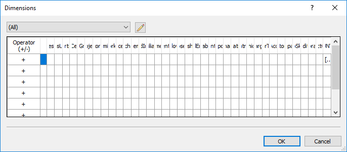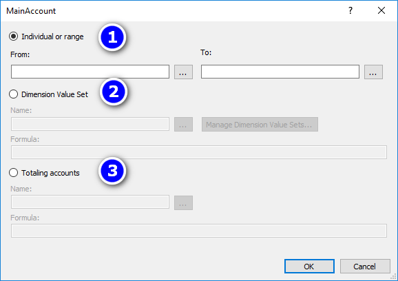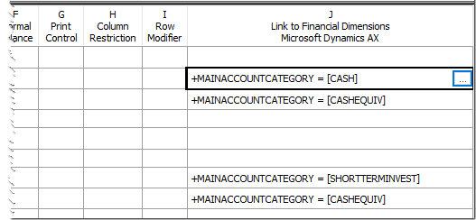 The parameters you enter in the “Dimensions” form are transformed into a string which is entered into the “Link to Financial Dimensions” cell. You can edit the string directly in the cell. Alternatively, instead of using the forms described here, you can prepare the strings you need in Excel, and then copy and paste them to the row definition.