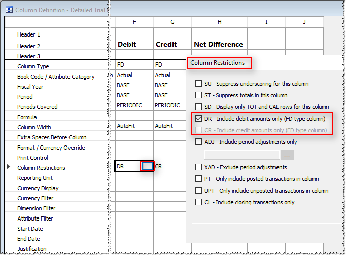 You can use the “CL – Include closing transactions only” column restriction in the column definition to get closing transaction amounts in financial reporting. Keep in mind that the “CL” option does not include transaction adjustments which can be posted by the “Closing period adjustments” (General ledger > Period close) menu item.