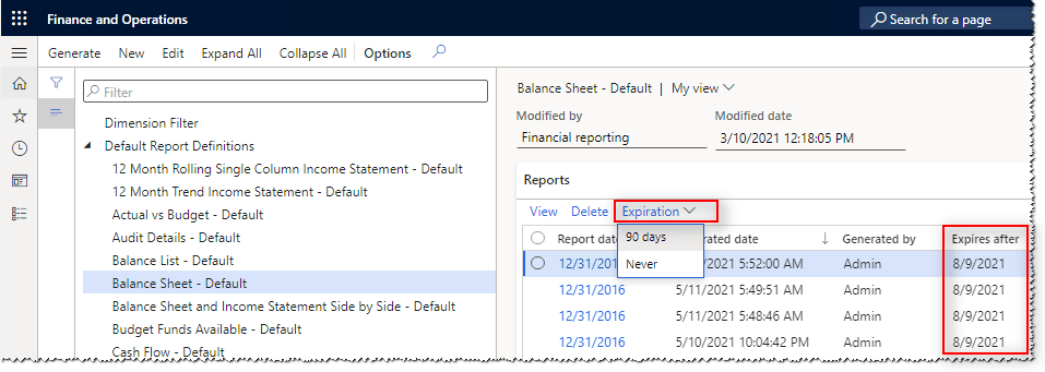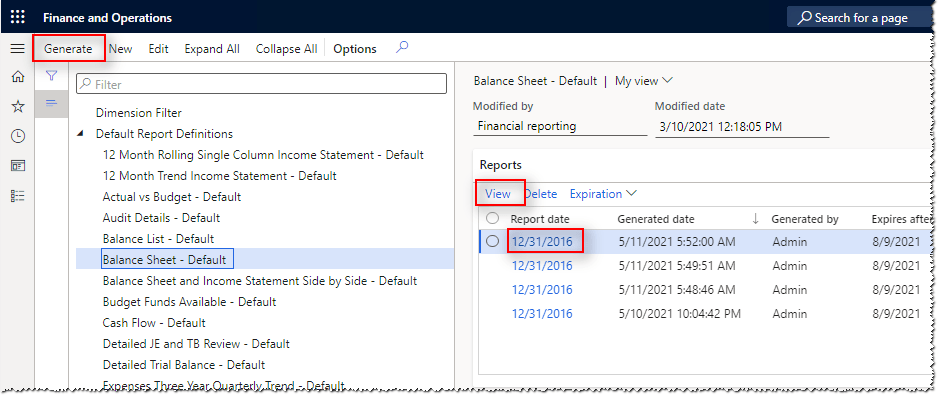 The most direct option to generate a report is to use the “Financial reports” (General ledger > Inquiries and reports) page in D365F. To generate the report, choose the needed line in the left pane and click the “Generated” button. Then specify the date which is used to calculate a base fiscal year and a period and click “OK.” After that, the system will generate the report.