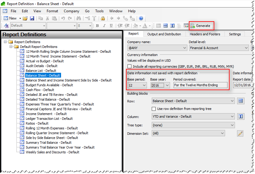 - If the report is generated from the report designer, then the year is based on the “Base year” field in the report definition form. The same is true when the report is generated from the report group.