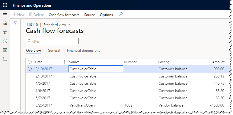 The form shows all financial dimensions defined in the system. Every dimension is presented in a specific column. You can find the financial dimensions by following “General ledger > Chart of accounts > Dimensions” in D365F. If there are a long list of defined financial dimensions, then the form becomes unreadable. You can define the dimension set and use it to only show the dimensions you need.