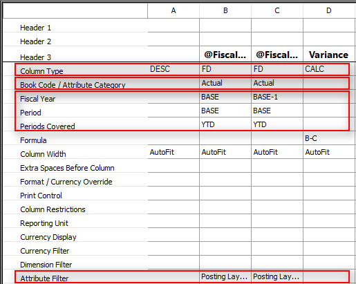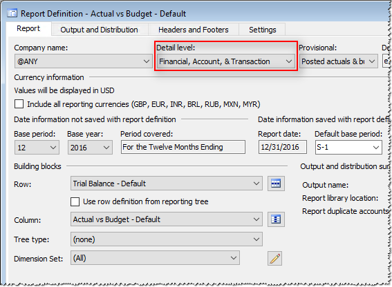 The important thing to remember is the following: in a typical scenario, the system queries the transactions by financial dimension values specified in the row, and for the period defined in the column.