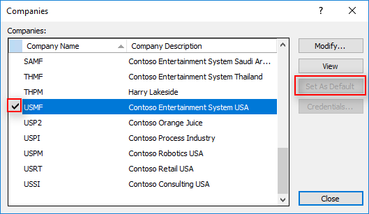 To set the default company in the report designer, you need to navigate to the “Company” form by the “Company / Companies…” menu, then select the company (legal entity) you need and click on the “Set As Default” button.