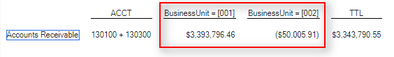 You have an option to filter by dimension values in the exact column of the report. For example, you can query all transactions of the exact ledger accounts for the whole row, and specify exact business units for the columns.