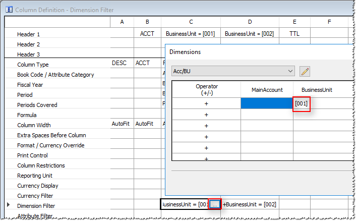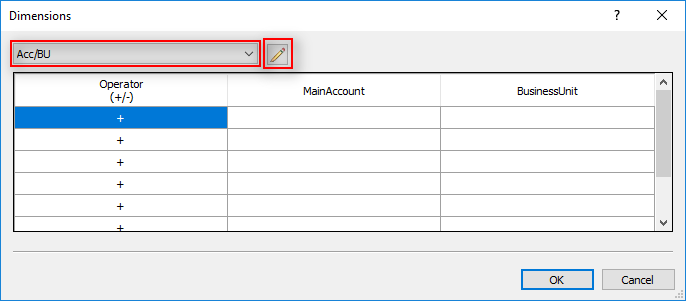 The parameters you enter in the “Dimensions” form are transformed into a string which is entered into the “Link to Financial Dimensions” cell. You can edit the string directly in the cell. Alternatively, instead of using the forms described here, you can prepare the strings you need in Excel, and then copy and paste them to the row definition.