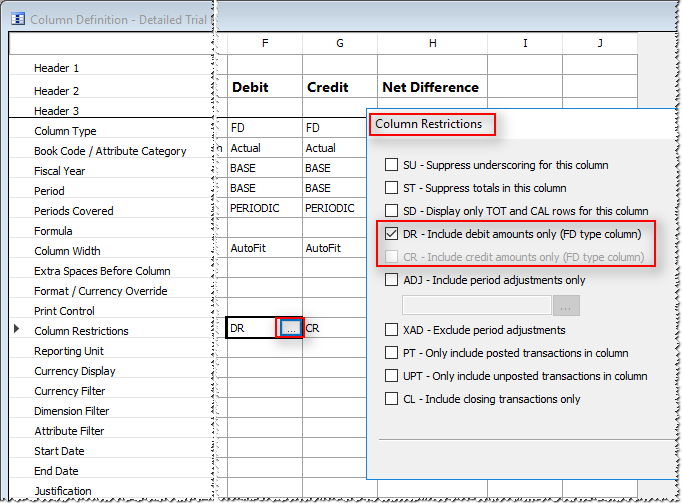 You have the option to override the following column definition parameters: fiscal year, period, and periods covered. To set up the period parameters for the exact rows, you can use an account modifier. This parameter is available through the “Row modifier” cell in the row definition.