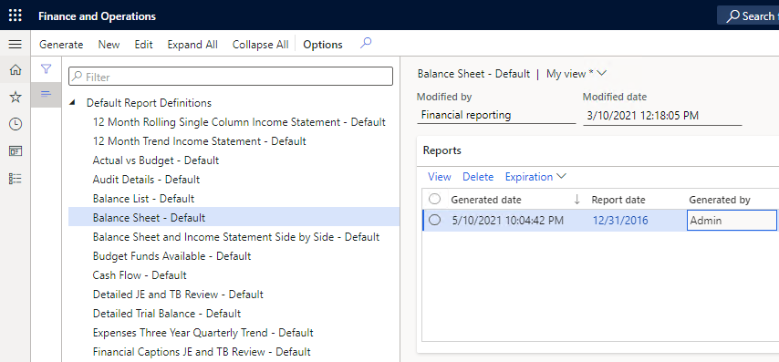 The most direct option to generate a report is to use the “Financial reports” (General ledger > Inquiries and reports) page in D365F. To generate the report, choose the needed line in the left pane and click the “Generated” button. Then specify the date which is used to calculate a base fiscal year and a period and click “OK.” After that, the system will generate the report.