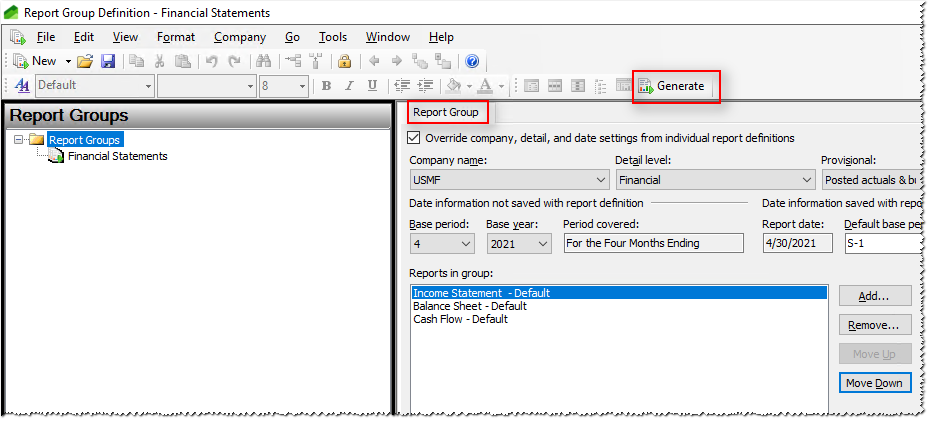 We have already covered how to generate the report from the designer. Similarly, it is also possible to generate a group of reports. To set up a group of reports, use the “Report groups” form in the report designer. This form allows you to set up the parameters which will be overwritten for the individual reports in the group.