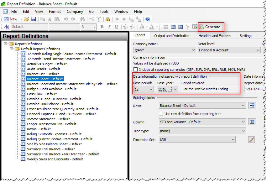 - If the report is generated from the report designer, then the year is based on the “Base year” field in the report definition form. The same is true when the report is generated from the report group.