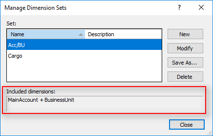 - Another option is to use a predefined dimension value set. To define the set, use the “Manage dimension Value Sets…” button. More about dimension value sets can be found here.