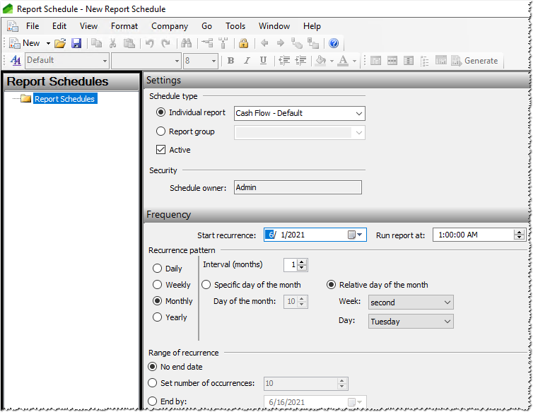 The image above shows an example for generating the cash flow report on every second Tuesday of the month.